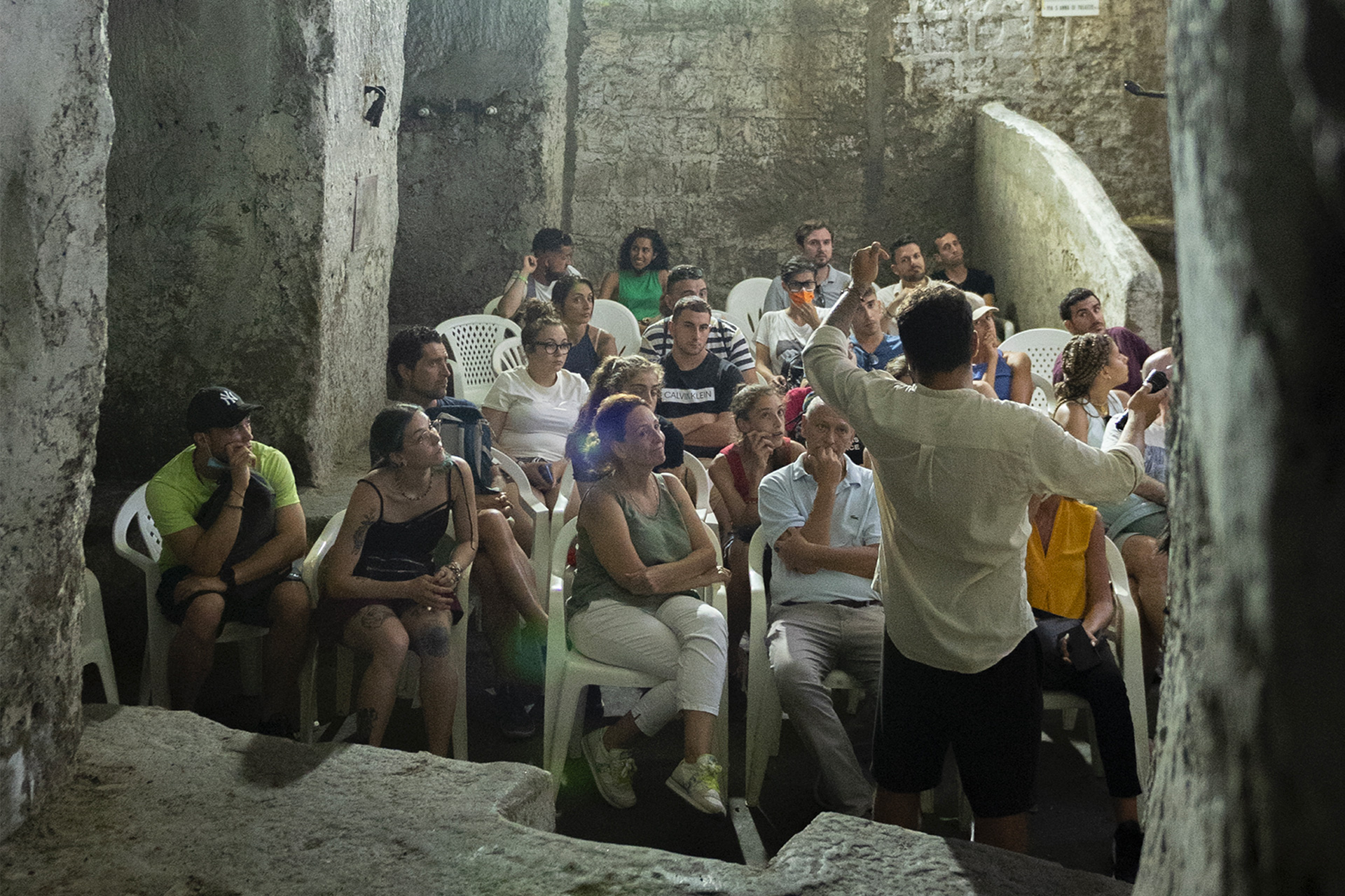 Guide appassionate e coinvolgenti vi condurranno tra cisterne e cunicoli (facoltativi) della più antica rete idrica mai esistita, creata dai Greci e rimasta in funzione fino alla fine del 1800, divenuta poi un luogo di difesa e speranza per migliaia di Napoletani durante i 103 bombardamenti subiti dalla città durante la Seconda Guerra Mondiale.